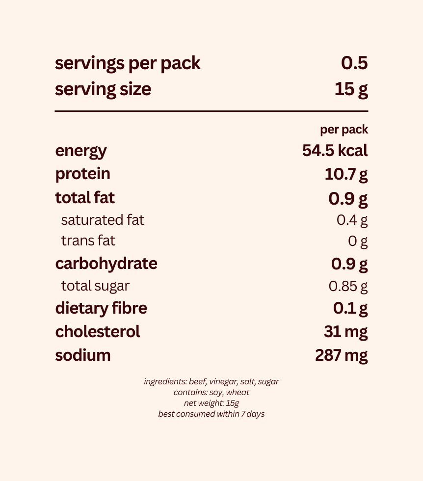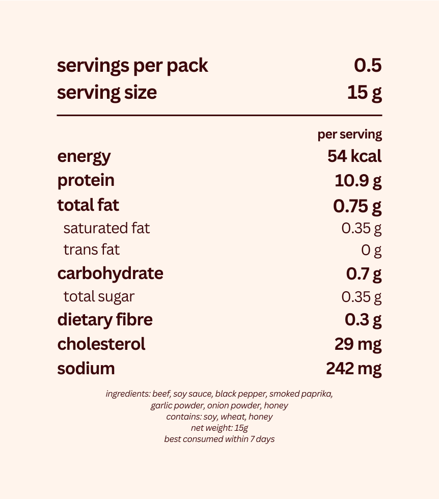 15g Original: Lightly seasoned with salt so the natural beef flavour comes through. Clean and savoury.